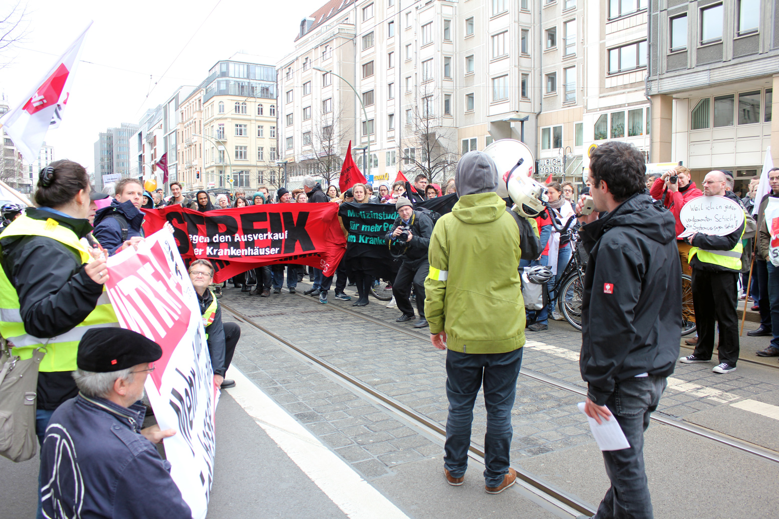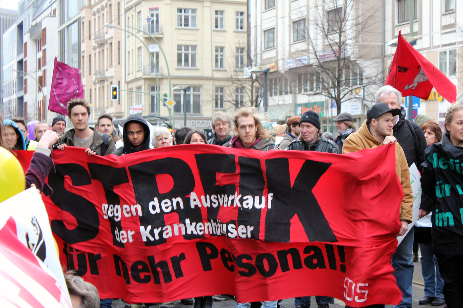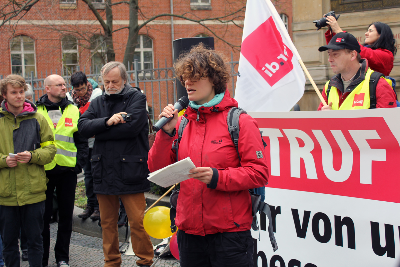 Auch einige der streikenden Kolleginnen und Kollegen der Vivantes-Kliniken, welche sich momentan ebenfalls in einer Tarifauseinandersetzung befinden, beteiligten sich an der Demonstration.