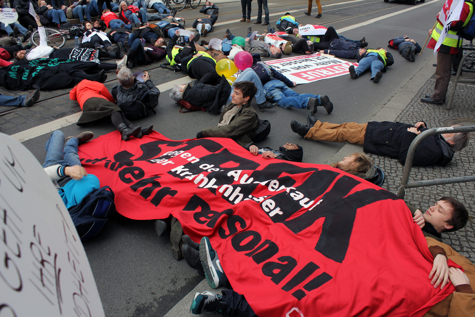 Um auf die katastrophale Situation in der Pflege aufmerksam zu machen, legten sich die Demonstrantinnen und Demonstranten kollektiv vor dem Bundesgesundheitsministerium auf den Boden.