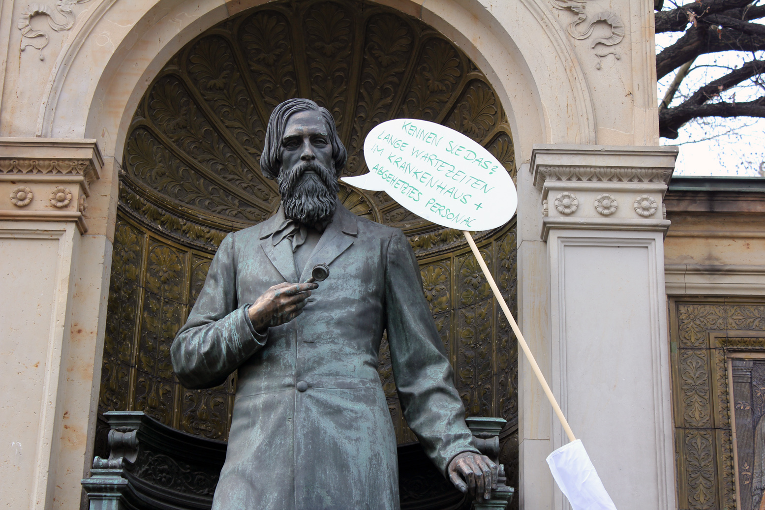 Vor dem Campus der Charité in Berlin-Mitte setzte ver.di am 17. März gemeinsam mit dem Bündnis „Berlinerinnen und Berliner für mehr Personal im Krankenhaus“ ein Zeichen gegen den Personalnotstand in den Krankenhäusern und für die breite Solidarität aus der Bevölkerung mit den Forderungen der Kolleginnen und Kollegen an der Charité.
